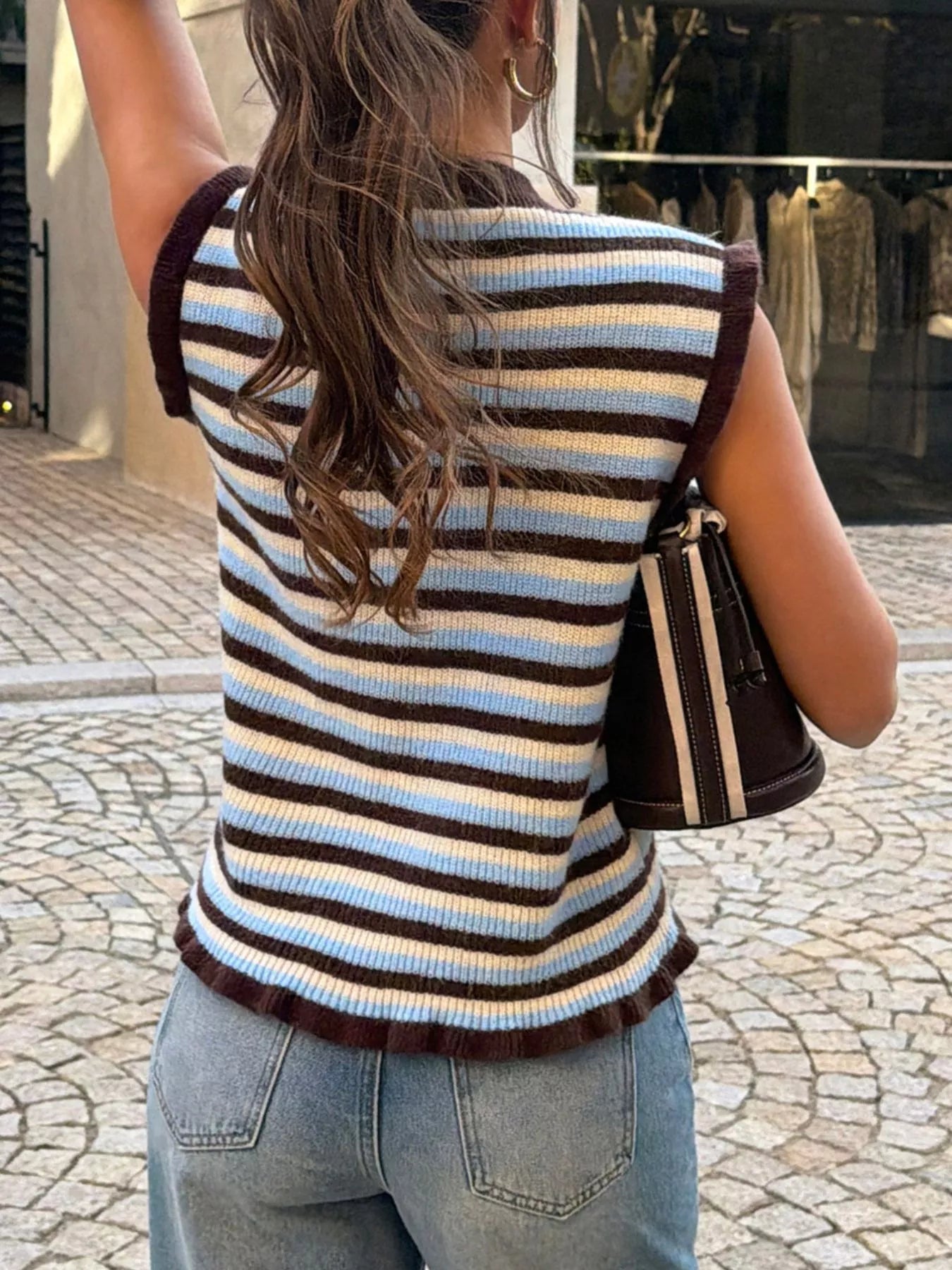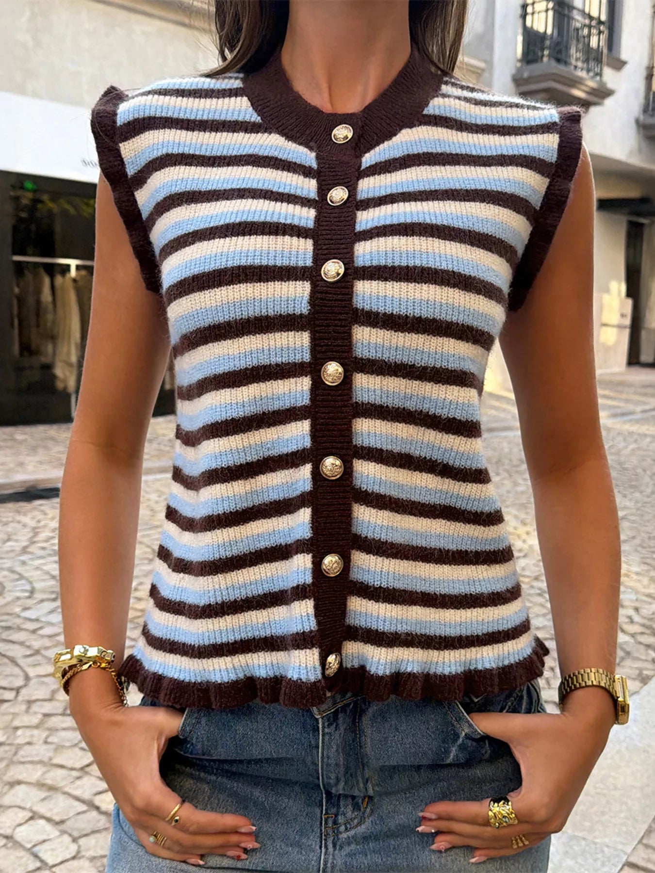 Striped Button-Down Sleeveless Knit Cardigan