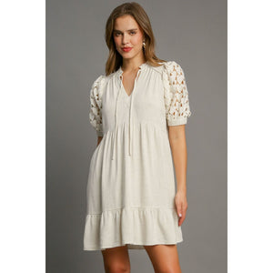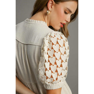 Umgee Full Size Ruffled Hem Heart Lace Sleeve Tie Neck Dress Plus Size