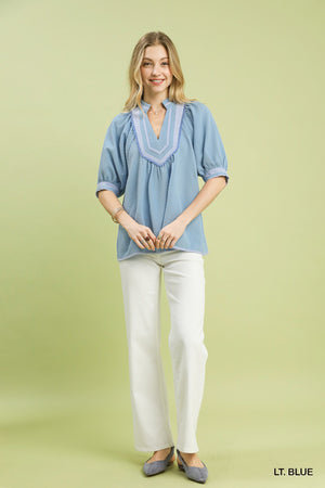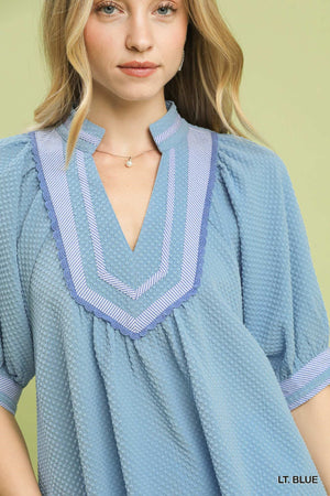 This textured jacquard contrast trim top is made with unique textured jacquard fabric, showcasing a stylish split neckline, cute puff short sleeves, and eye-catching stripe contrast details, while its unlined design ensures lightweight comfort and a chic, easy-to-style look for everyday wear.