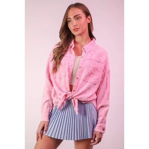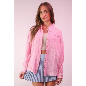 The Mineral Washed Gauze Button Down Shirt Top is a versatile and trendy piece that adds a relaxed vibe to your wardrobe. The mineral washed finish gives it a unique and slightly vintage look. This top features a button-down design for easy styling and a casual feel. Made from breathable gauze fabric, it's perfect for staying cool during the warmer months. Pair it with jeans for a casual day out or dress it up with trousers for a more polished look. This shirt top is a must-have for adding a touch of effortless cool to your outfit!