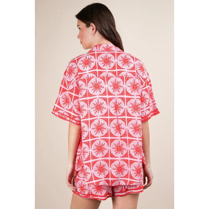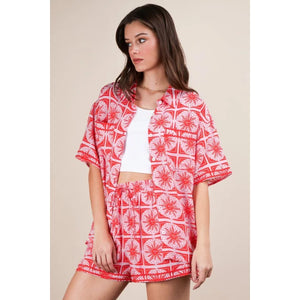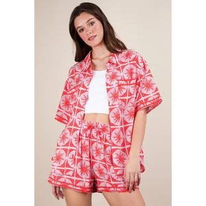 A tropical printed shirt top and shorts set is a stylish and coordinated outfit choice for warm weather. The vibrant print evokes a vacation-ready vibe, while the matching top and shorts create a cohesive and put-together look. This set is perfect for beach days, summer outings, or tropical getaways. Pair it with sandals and sunglasses for a trendy and effortless ensemble.