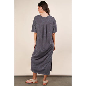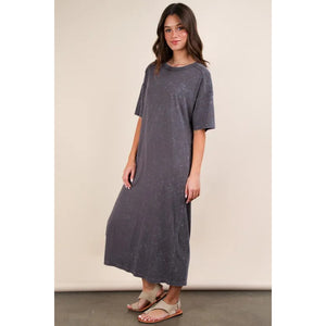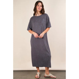 A mineral washed casual comfy midi dress is perfect for relaxed, everyday wear. The mineral wash gives it a unique, slightly faded look. This versatile dress can be dressed up with accessories or styled casually for a comfortable outfit.