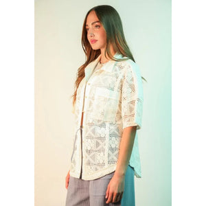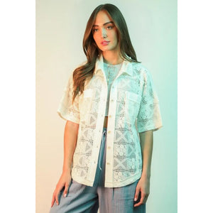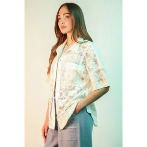 An oversized crochet button-down shirt top is a stylish and breezy choice. The crochet detailing adds a bohemian touch to the oversized silhouette. The button-down feature offers versatility in styling options. Perfect for a relaxed yet fashionable look.
