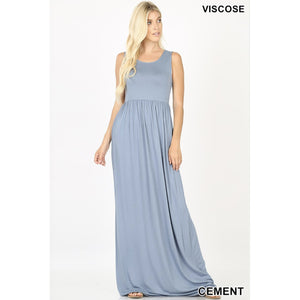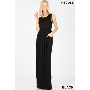 VISCOSE SLEEVELESS ROUND NECK MAXI DRESS WITH WAIST SHIRRING AND SIDE POCKETS
