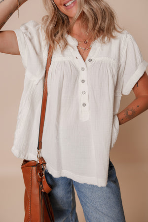 White Textured Short Sleeve Buttons Frayed Blouse