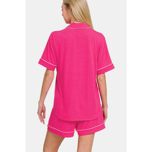 Zenana Button Down Short Sleeve Top and Shorts Lounge Set
