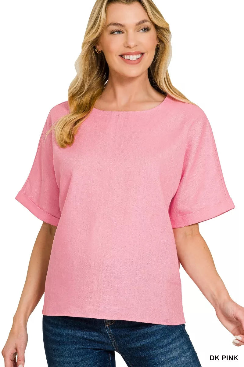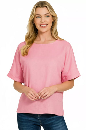 Zenana Linen Round Neck Cuffed Sleeve Top