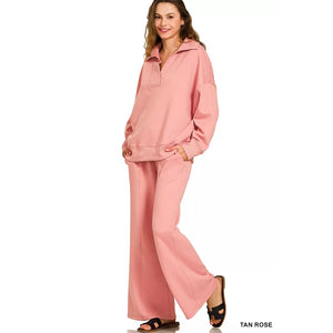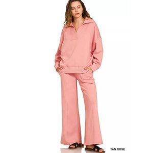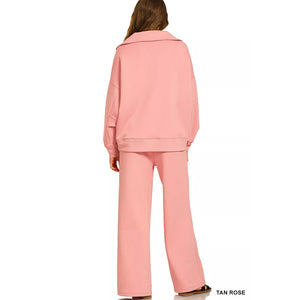 Step up your loungewear game with this sleek scuba collared pullover and pants set. The scuba material offers a modern and stylish look, while the collared design adds a touch of refinement. Perfect for relaxing at home or running errands in comfort and style. Elevate your casual wear with this coordinating set. A must-have addition to your leisure wardrobe.