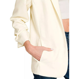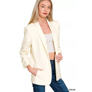 Zenana Woven 3/4 Ruched Sleeve Open Front Classic Blazer
