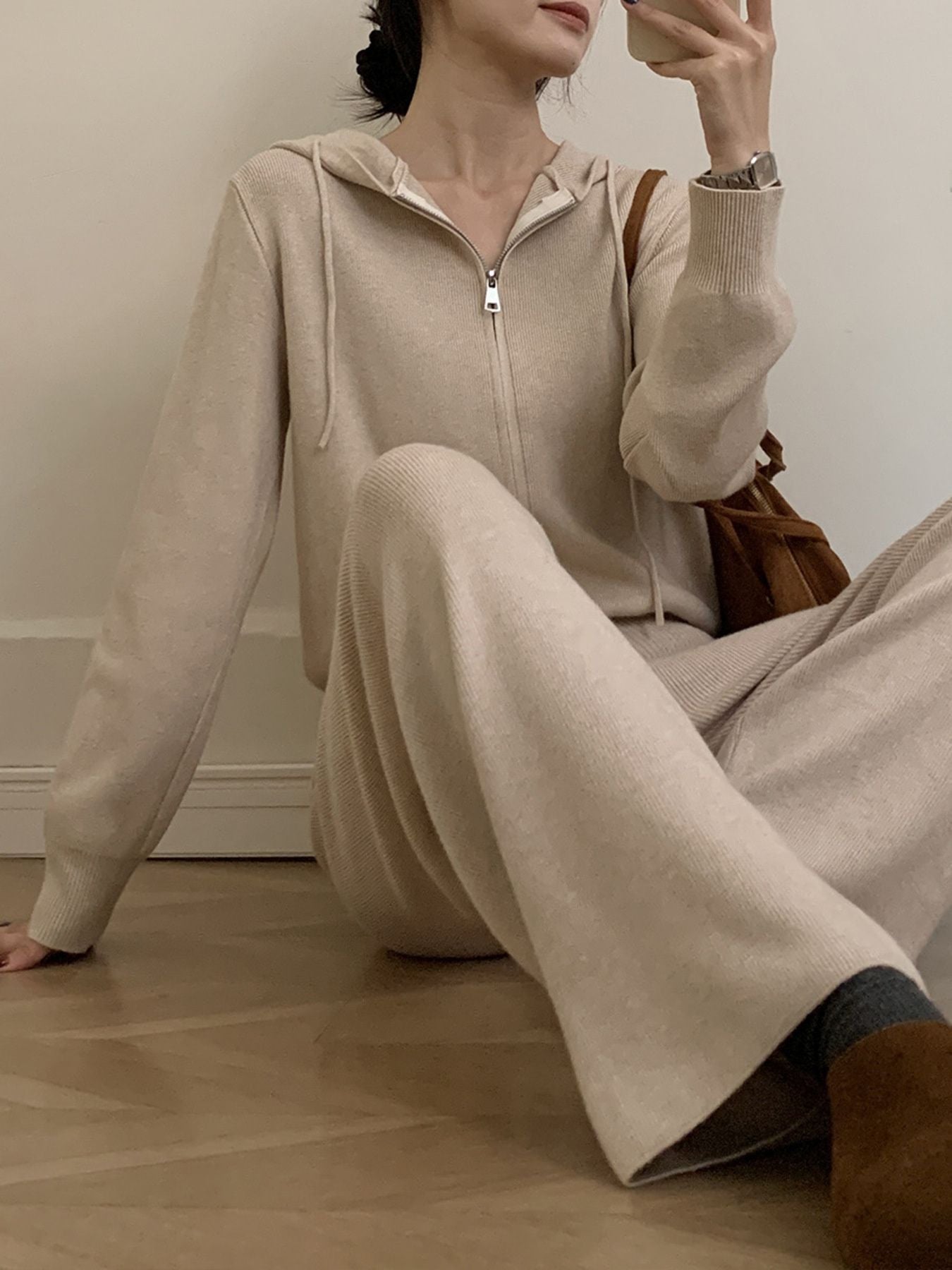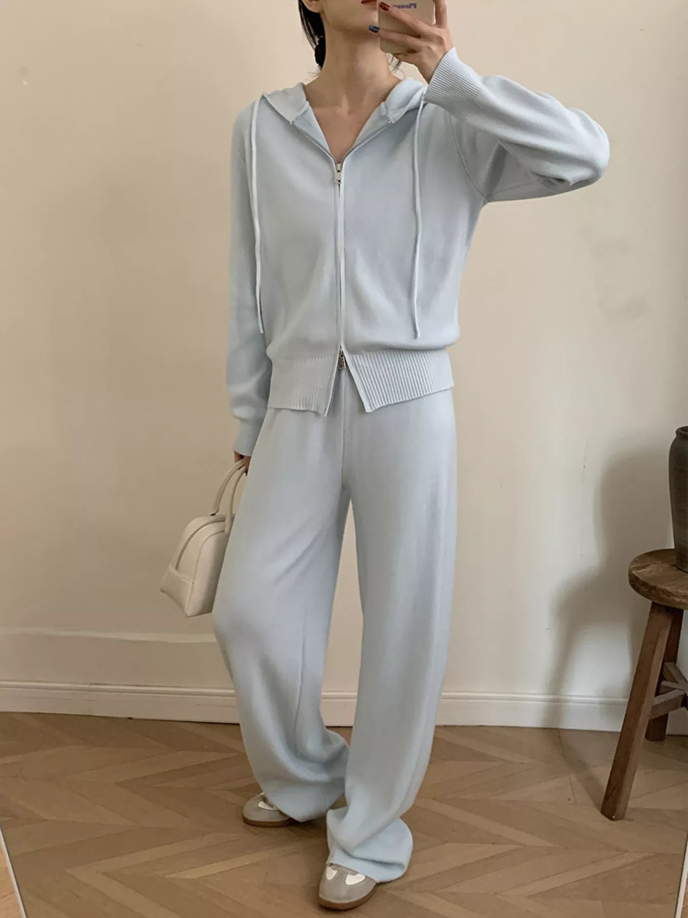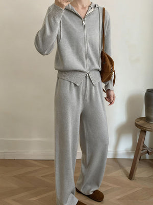 Zip Up Cardigan and Drawstring Wide Leg Pants Knit Set